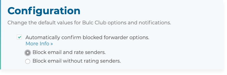 Bulc Club also allows you to automatically block and rate all email addresses that send mail to disabled forwarders. Upon blocking a forwarder, you will be prompted to confirm you want to block all mail from the forwarder and asked if you'd like to automatically rate all mail sent to that forwarder as spam before it's queued for deletion.